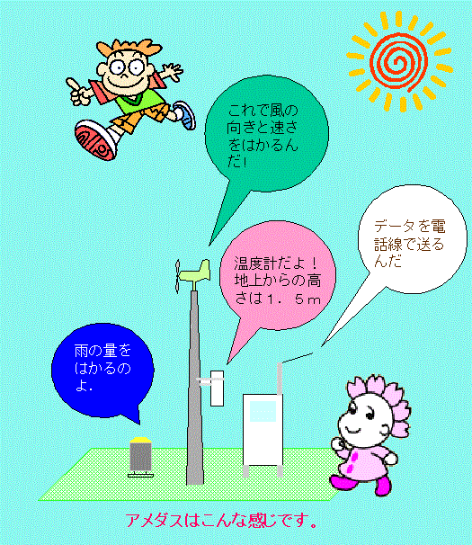 アメダスといいますが、雨だけでなく、気温や風、積雪(せきせつ)の深さを観測(かんそく)しているところもあります。