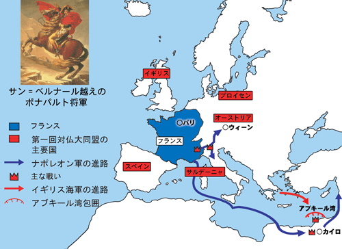 1799年には敵国イギリスとインドとの連絡を絶つ目的で、ナポレオンはエジプトへ遠征した。陸上ではナポレオンはイギリスを撃破しエジプトを占領したが、