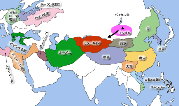 12世紀のモンゴル高原では、モンゴル系やトルコ系の諸部族が遼や金の支配下で遊牧生活を送っていた。モンゴル族の名門の家に生まれたテムジンは、幼い時に父を亡くし苦労したが、13世紀初頭に諸部族を統一し、クリルタイ(集会)でハン位に推戴されチンギス=ハンの称号を得、機動性に富む騎馬軍団をつくりあげた。そして、彼はこの騎馬軍団を率いて征服活動をおこなったのである。
